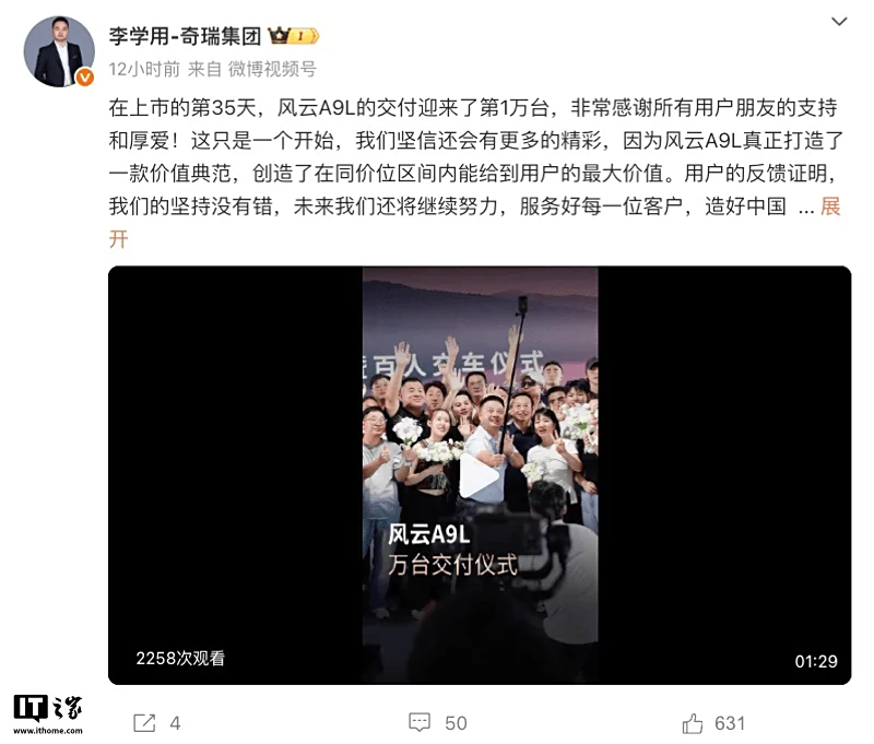 IT之家 8 月 25 日消息,奇瑞汽车执行副总裁李学用在微博发文,宣布奇瑞风云 A9L 车型上市 35 天迎来第 1 万台新车交付。该车于 7 月 8 日正式上市,共推出 4 款车型,售价区间 14.99-20.79 万元,置换抢购价 13.99-19.79 万元。